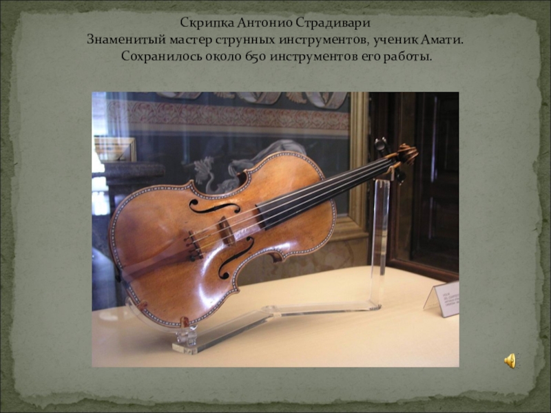 Слайд 7Скрипка Антонио Страдивари Знаменитый мастер струнных инструментов, ученик Амати. Сохранилось около 650