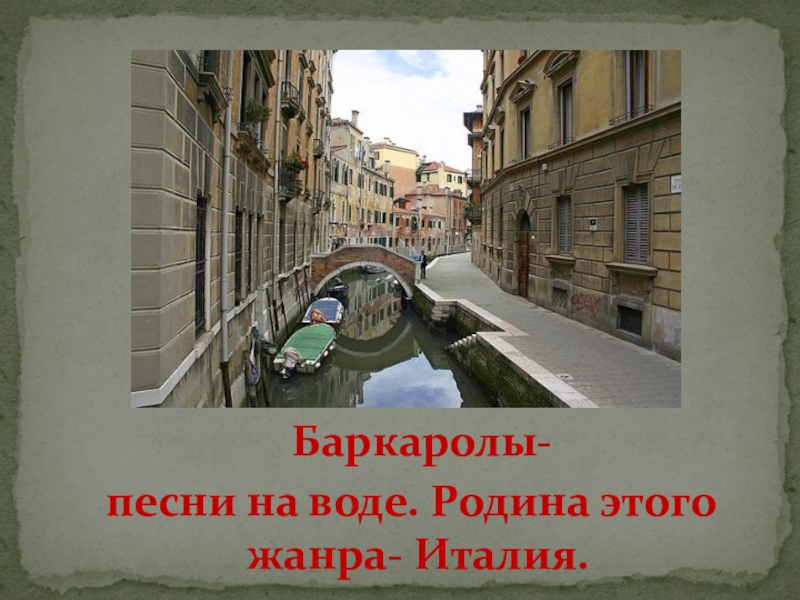 Баркаролы- песни на воде. Родина этого жанра- Италия.