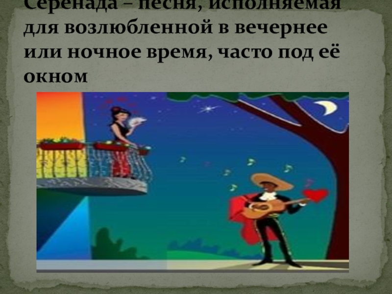 Слайд 8Серенада – песня, исполняемая для возлюбленной в вечернее или ночное время,