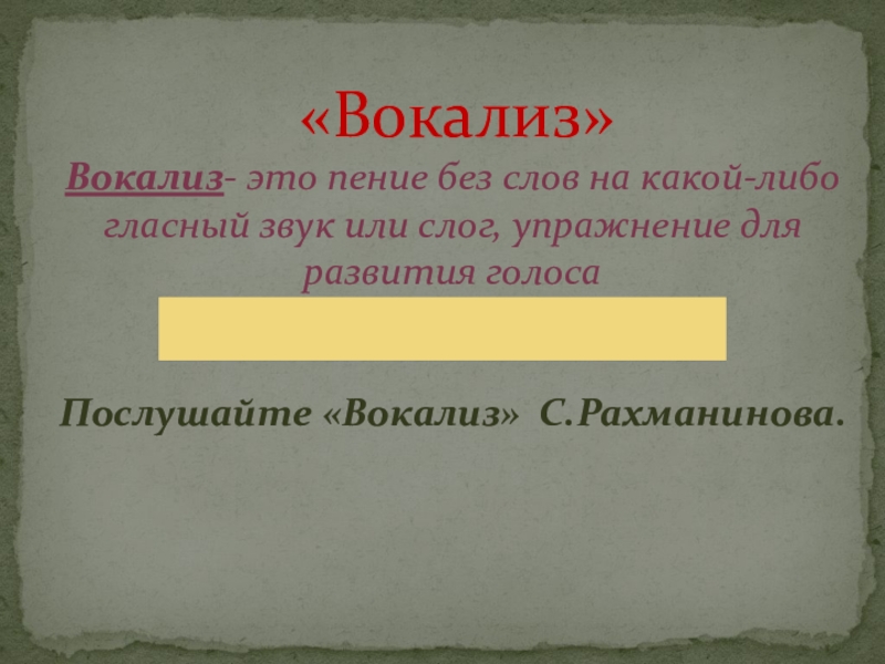 «Вокализ»Вокализ- это пение без слов на какой-либо гласный звук или слог, упражнение для развития голосаПослушайте «Вокализ»