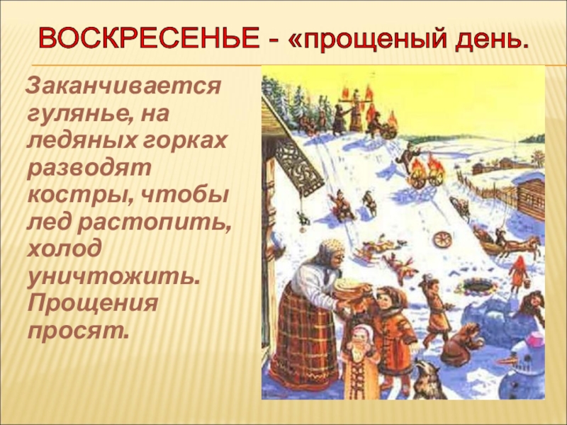Заканчивается гулянье, на ледяных горках разводят костры, чтобы лед растопить, холод уничтожить. Прощения просят.ВОСКРЕСЕНЬЕ