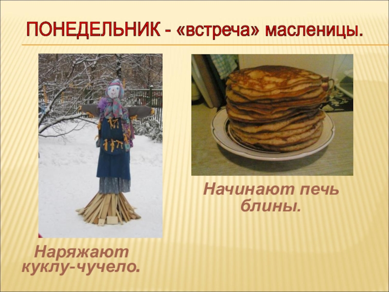 Наряжают куклу-чучело.ПОНЕДЕЛЬНИК - «встреча» масленицы.   Начинают печь блины.