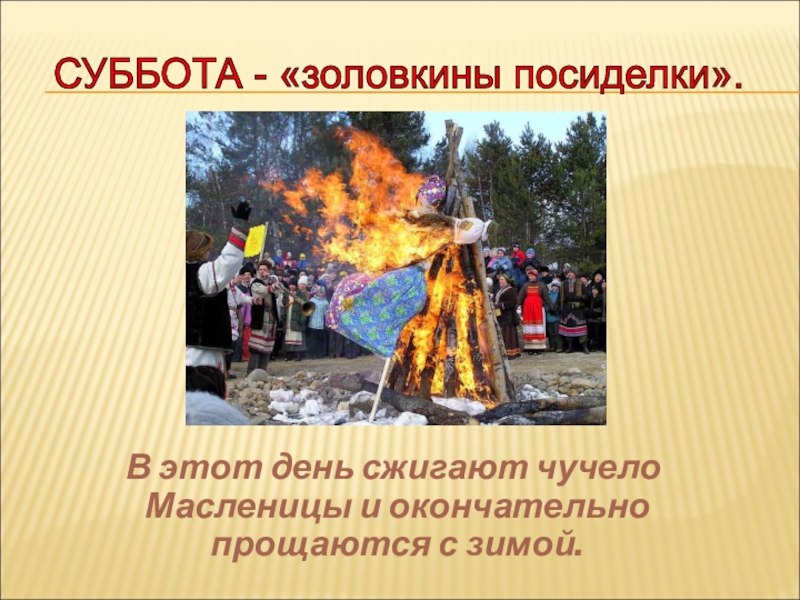 СУББОТА - «золовкины посиделки».  В этот день сжигают чучело Масленицы и окончательно прощаются с зимой.