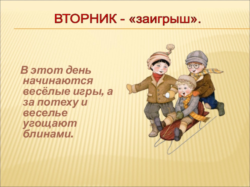 В этот день начинаются весёлые игры, а за потеху и веселье угощают блинами.ВТОРНИК - «заигрыш».