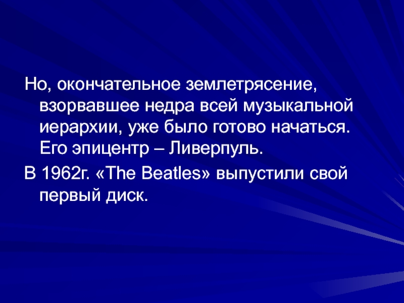 Но, окончательное землетрясение, взорвавшее недра всей музыкальной иерархии, уже было готово начаться. Его эпицентр – Ливерпуль. В