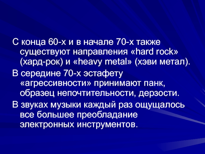С конца 60-х и в начале 70-х также существуют направления «hard rock» (хард-рок) и «heavy metal» (хэви