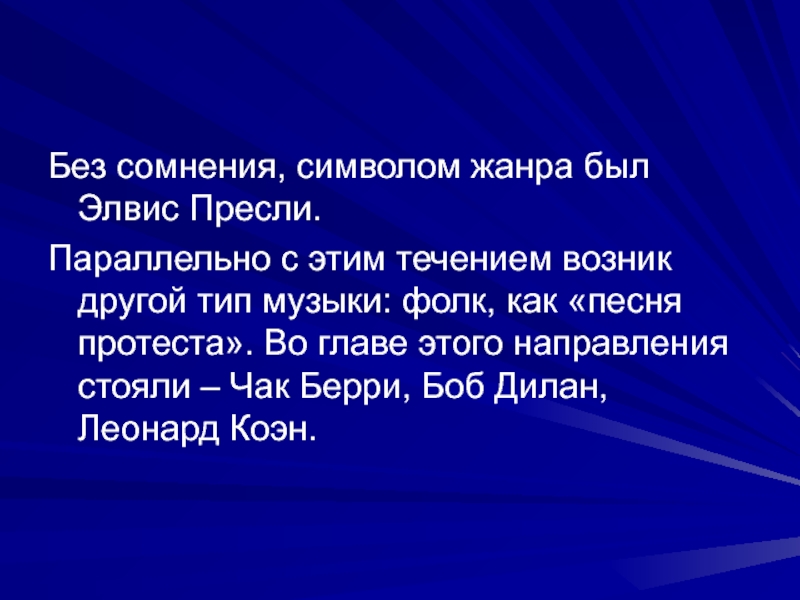 Без сомнения, символом жанра был Элвис Пресли.Параллельно с этим течением возник другой тип музыки: фолк, как «песня