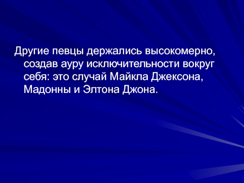 Другие певцы держались высокомерно, создав ауру исключительности вокруг себя: это случай Майкла Джексона, Мадонны и Элтона Джона.
