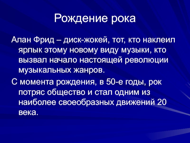 Рождение рокаАлан Фрид – диск-жокей, тот, кто наклеил ярлык этому новому виду музыки, кто вызвал начало настоящей революции музыкальных жанров.С момента рождения, в 50-е годы, рок потряс общество и стал одним из наиболее своеобразных движений 20