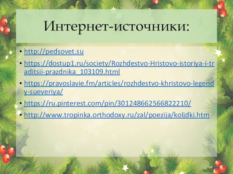 Интернет-источники:http://pedsovet.suhttps://dostup1.ru/society/Rozhdestvo-Hristovo-istoriya-i-traditsii-prazdnika_103109.htmlhttps://pravoslavie.fm/articles/rozhdestvo-khristovo-legendy-sueveriya/https://ru.pinterest.com/pin/301248662566822210/http://www.tropinka.orthodoxy.ru/zal/poezija/koljdki.htm