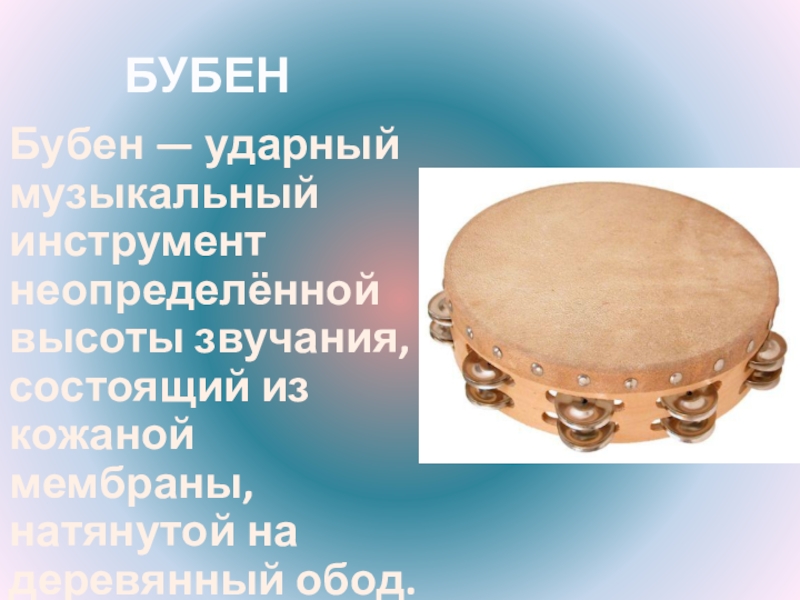 БУБЕНБубен — ударный музыкальный инструмент неопределённой высоты звучания, состоящий из кожаной мембраны, натянутой на деревянный обод.