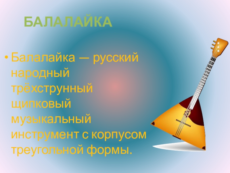 БАЛАЛАЙКАБалалайка — русский народный трёхструнный щипковый музыкальный инструмент с корпусом треугольной формы.
