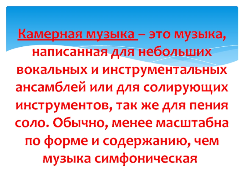 Камерная музыка – это музыка, написанная для небольших вокальных и инструментальных ансамблей или для солирующих инструментов, так же для пения соло. Обычно, менее масштабна по форме и содержанию, чем музыка симфоническая.