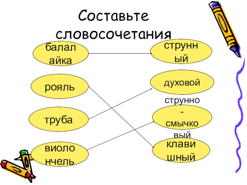 Составьте словосочетаниябалалайкарояльтрубадуховойструнныйструнно-смычковыйвиолончельклавишный