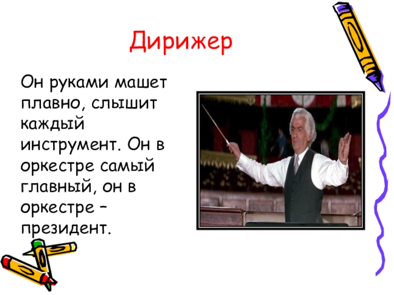 ДирижерОн руками машет плавно, слышит каждый инструмент. Он в оркестре самый главный, он в оркестре – президент.