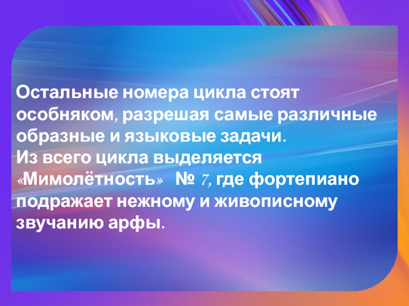 Из всего цикла выделяется «Мимолётность» № 7, где фортепиано подражает нежному и живописному звучанию арфы.
