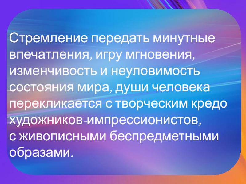 Слайд 5Стремление передать минутные впечатления, игру мгновения, изменчивость и неуловимость состояния мира,