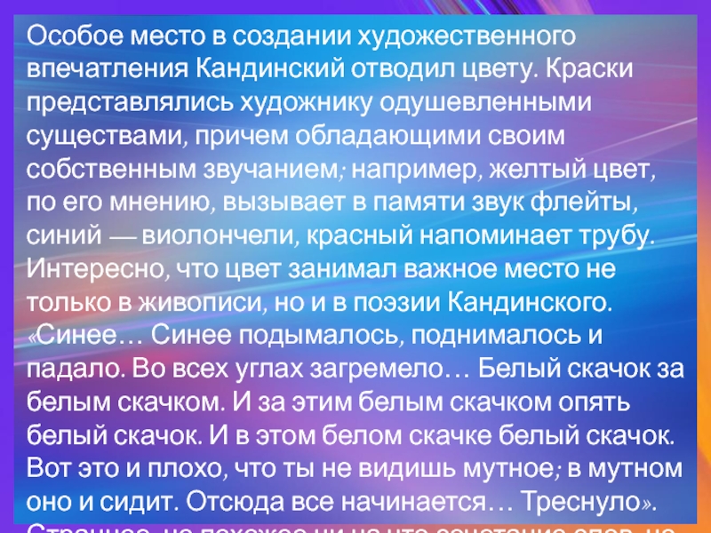 художнику одушевленными существами, причем обладающими своим собственным звучанием; например, желтый цвет, по его мнению, вызывает в памяти звук флейты, синий — виолончели, красный напоминает трубу. Интересно, что цвет занимал важное место не только в живописи, но и в поэзии Кандинского. «Синее… Синее подымалось, поднималось и падало. Во всех углах загремело… Белый скачок за белым скачком. И за этим белым скачком опять белый скачок. И в этом белом скачке белый скачок. Вот это и плохо, что ты не видишь мутное; в мутном оно и сидит. Отсюда все начинается… Треснуло». Странное, не похожее ни на что сочетание слов, но, наверное, только так и можно описать вербально картины Кандинского.