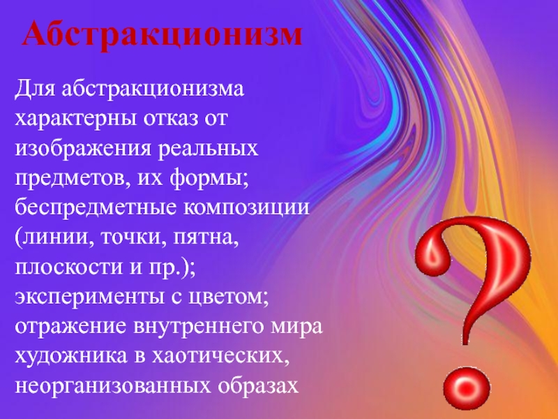Слайд 16Для абстракционизма характерны отказ от изображения реальных предметов, их формы; беспредметные