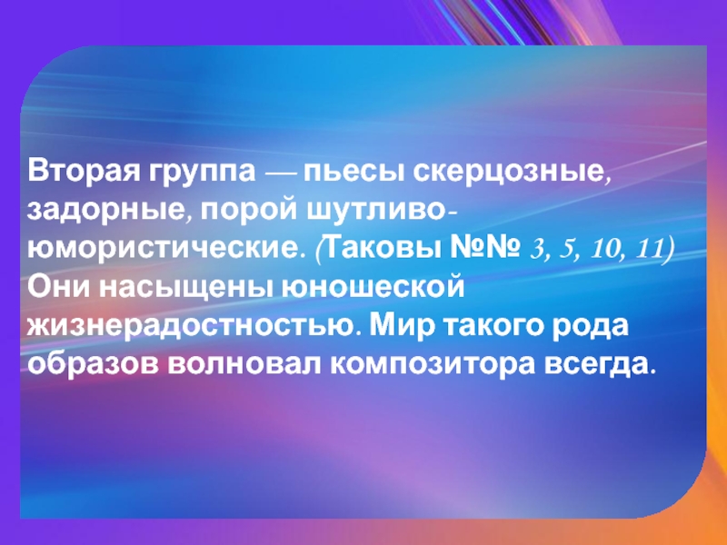 Слайд 7Вторая группа — пьесы скерцозные, задорные, порой шутливо-юмористические. (Таковы №№ 3,