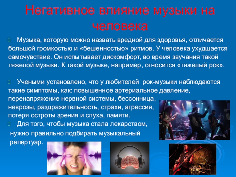 большой громкостью и «бешенностью» ритмов. У человека ухудшается