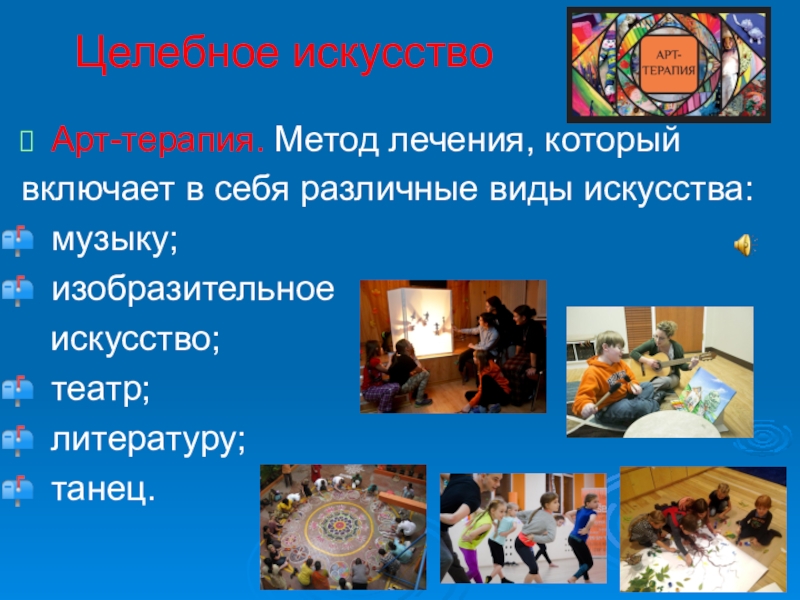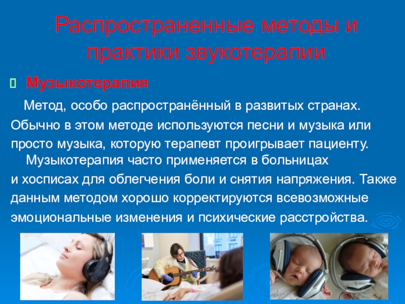 просто музыка, которую терапевт проигрывает пациенту. Музыкотерапия часто применяется в больницах