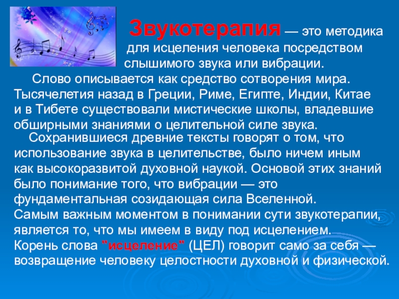 обширными знаниями о целительной силе звука. Сохранившиеся древние тексты говорят о том, что