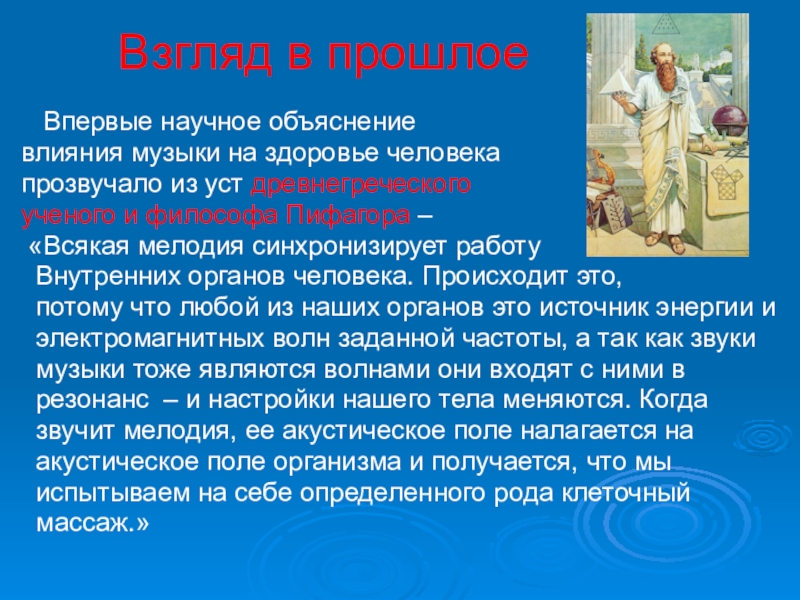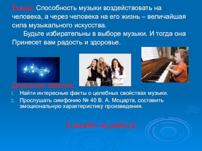 особенно сердечнососудистая система и дыхание. Таким образом, музыкальный ритм влияет на человека, на его эмоциональное и физическое состояние, на здоровье. Благотворно энергия звуков влияет на человека, который исполняет музыку, поет.