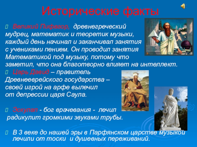 В 3 веке до нашей эры в Парфянском царстве музыкой лечили от тоски и душевных переживаний.