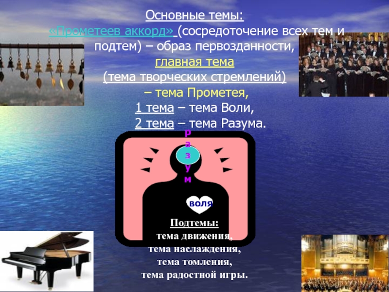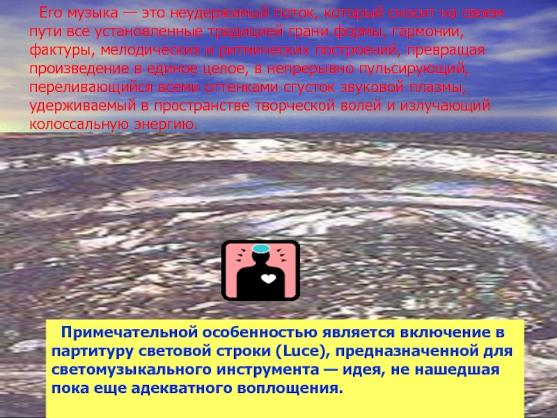 Cверхзадача композитора - воплотить «биографию духа» в музыкальных звучаниях в виде живого, непрерывно меняющего краски, цельного потока чувств, небывалых по разнообразию и интенсивности.