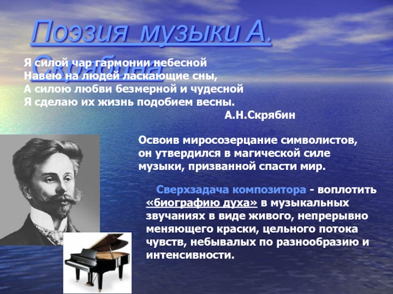 Музыка Скрябина – это энергия, огонь, свет, жизнь, борьба, усилие, мысль.