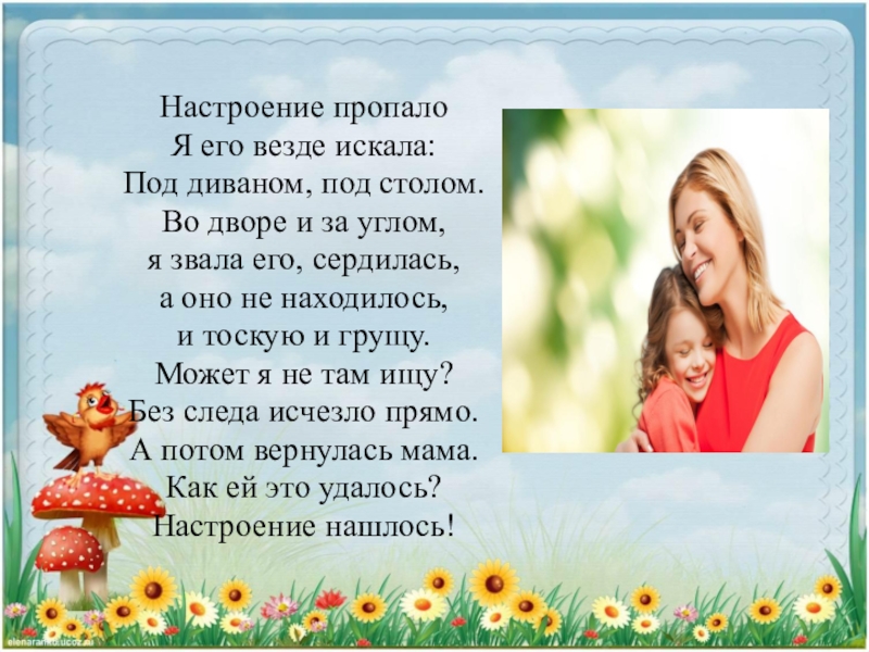 Настроение пропалоЯ его везде искала:Под диваном, под столом.Во дворе и за углом,я звала его, сердилась,а оно не находилось,и тоскую и грущу.Может я не там ищу?Без следа исчезло прямо.А потом вернулась мама.Как ей это удалось?Настроение нашлось!