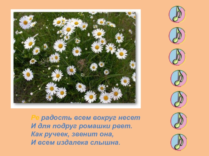 Слайд 9Ре радость всем вокруг несет И для подруг ромашки рвет. Как ручеек, звенит