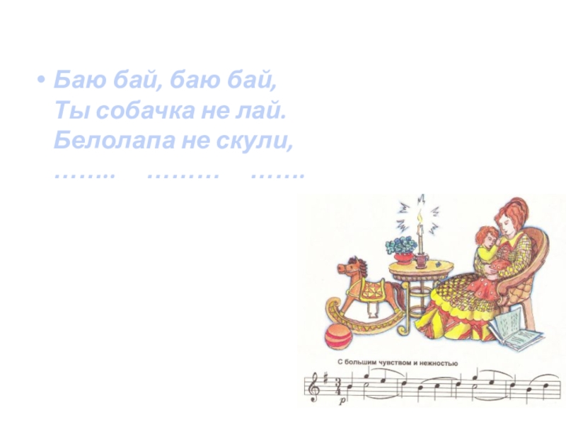 Баю бай, баю бай, Ты собачка не лай. Белолапа не скули, ……..   ………