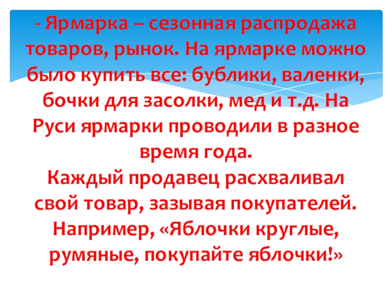 купить все: бублики, валенки, бочки для засолки, мед и т.д. На Руси ярмарки проводили в разное время года. Каждый продавец расхваливал свой товар, зазывая покупателей. Например, «Яблочки круглые, румяные, покупайте яблочки!»