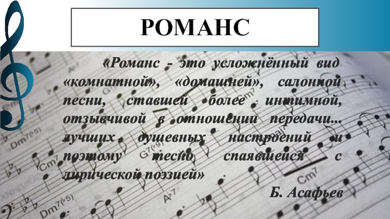 Романс    «Романс - это усложнённый вид «комнатной», «домашней», салонной песни, ставшей более интимной, отзывчивой