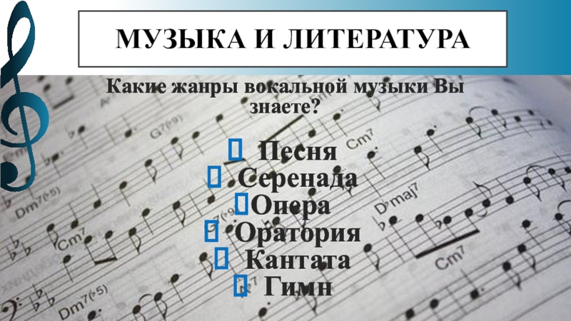 Музыка и литератураКакие жанры вокальной музыки Вы знаете? Песня СеренадаОпера Оратория Кантата Гимн