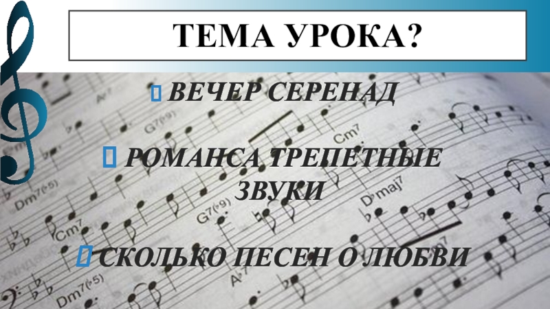 Тема урока? ВЕЧЕР СЕРЕНАД РОМАНСА ТРЕПЕТНЫЕ ЗВУКИ СКОЛЬКО ПЕСЕН О ЛЮБВИ