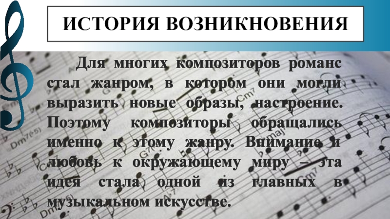 История возникновения  Для многих композиторов романс стал жанром, в котором они могли выразить новые образы, настроение.