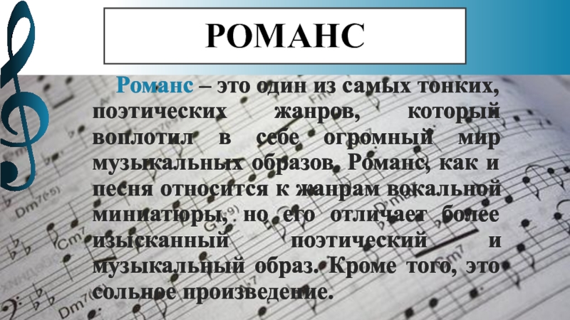 романс    Романс – это один из самых тонких, поэтических жанров, который воплотил в себе