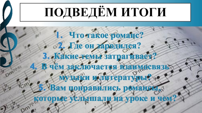 Подведём Итоги Что такое романс?Где он зародился?Какие темы затрагивает?В чём заключается взаимосвязь музыки и литературы?Вам понравились романсы,