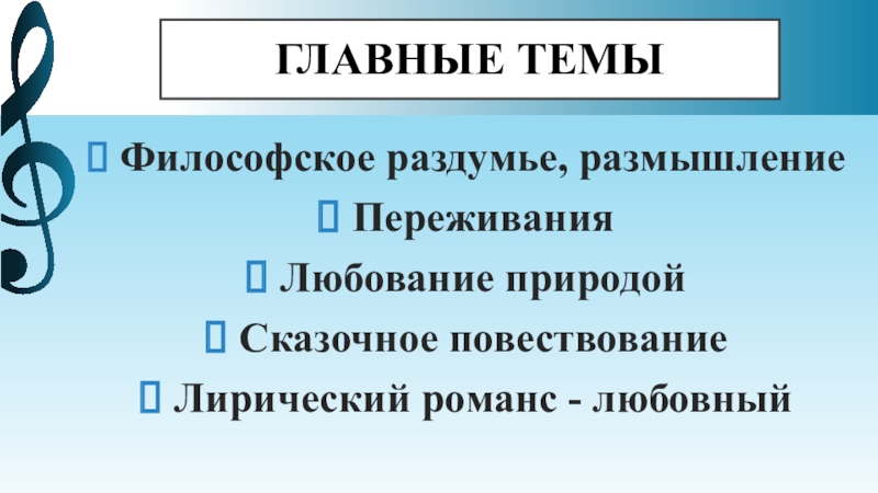 Главные темы Философское раздумье, размышление Переживания Любование природой Сказочное повествование Лирический романс - любовный