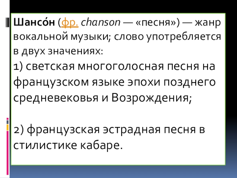 Слайд 5Шансо́н (фр. chanson — «песня») — жанр вокальной музыки; слово употребляется в двух значениях: