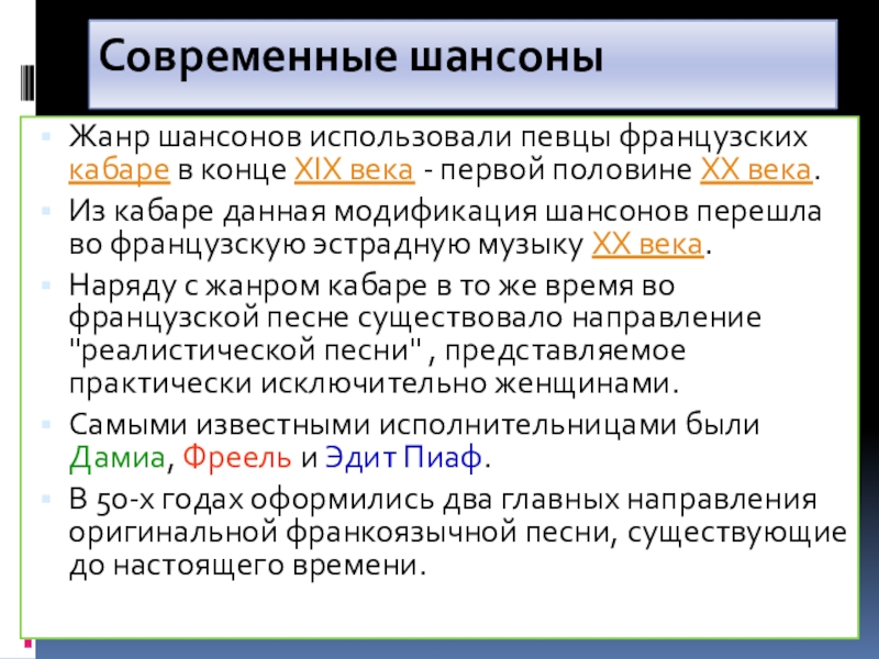 Жанр шансонов использовали певцы французских кабаре в конце XIX века