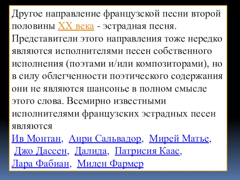 Слайд 15Другое направление французской песни второй половины XX века - эстрадная песня.