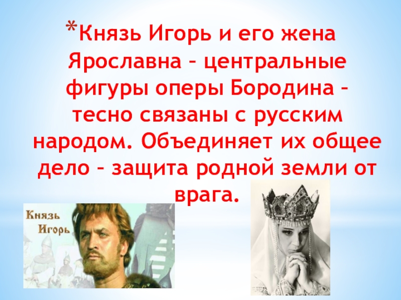 Князь Игорь и его жена Ярославна – центральные фигуры оперы Бородина – тесно связаны с русским народом.