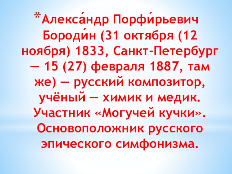 (27) февраля 1887, там же) — русский композитор, учёный — химик и медик. Участник «Могучей кучки». Основоположник русского эпического симфонизма.