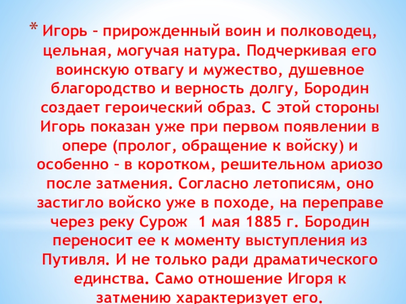 воинскую отвагу и мужество, душевное благородство и верность долгу, Бородин создает героический образ. С этой стороны Игорь показан уже при первом появлении в опере (пролог, обращение к войску) и особенно – в коротком, решительном ариозо после затмения. Согласно летописям, оно застигло войско уже в походе, на переправе через реку Сурож 1 мая 1885 г. Бородин переносит ее к моменту выступления из Путивля. И не только ради драматического единства. Само отношение Игоря к затмению характеризует его.
