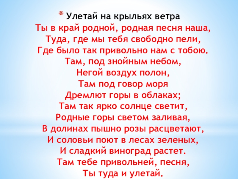 Улетай на крыльях ветра Ты в край родной, родная песня наша, Туда, где мы тебя свободно пели,