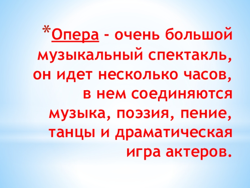 Слайд 4Опера - очень большой музыкальный спектакль, он идет несколько часов, в